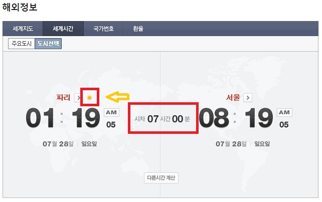 직접 계산을 해서 알 수도 있지만 프랑스 파리 시차를 실수하지 않을까 걱정된다면 포털사이트에서 시차를 확인해 보는 방법도 있습니다. 프랑스 시차라고 검색을 하거나 파리 시차라고 검색하면 정확한 시간을 확인할 수 있습니다. 서머타임이라는 것이 있어서 헷갈리거나 틀릴 수도 있는 만큼 중요한 용무가 있을 경우 포털사이트를 활용하는 것이 좋습니다.